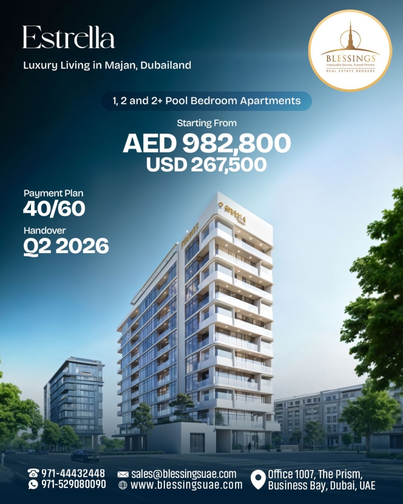 Starting Prices AED 982800 /- PAYMENT PLAN During Construction 40 % On Handover 60 % Handover 2026 AMENITIES Fitness Club EV Charging Station Cabanas & Sunbeds Roof-top Pool Bar B...