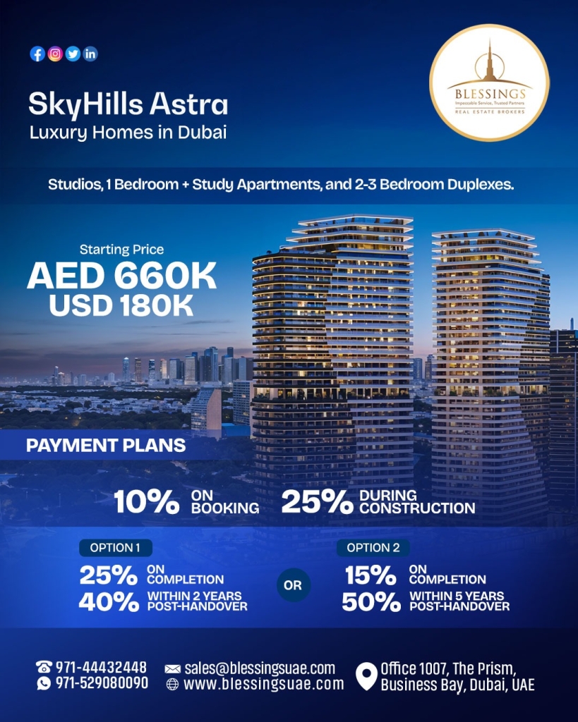 sky hills astra represents a commitment to make the would a better place. Starting Prices AED 660000 /- PAYMENT PLAN On Booking 10 % During Construction 25 % On Completion 25 % 2 Year Post Handover 40 % OR On Completion 15 % 5 Year Post...