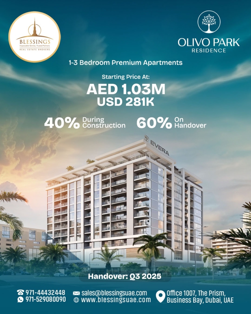 Experience the perfect blend of comfort and luxury at OLIVO PARK RESIDENCES. Starting Prices AED 1.3 Million PAYMENT PLAN During Construction 40 % On Handover 60 % Handover 2025 AMENITIES Gym Sauna Pool Chill-out...